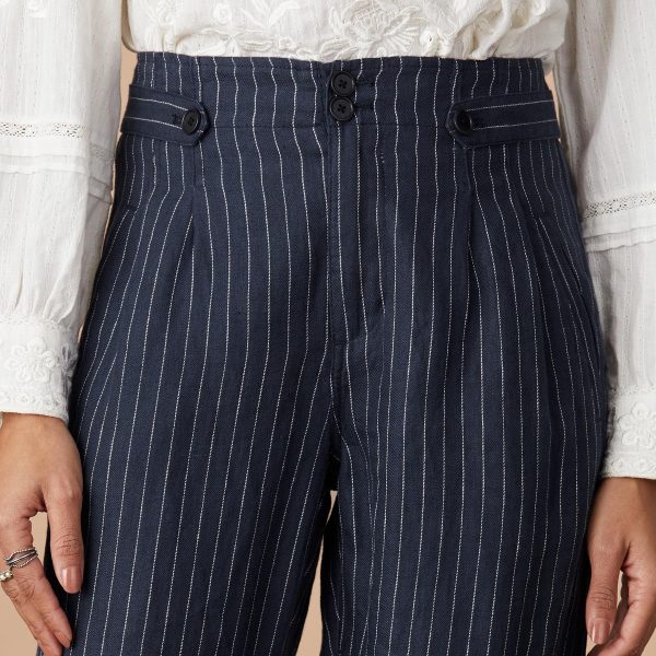 Menswear inspired with a feminine twist. our stylish four pocket pants with pinstripes have a comfortable tapered leg. classic waistband tab details and a sophisticated double button closure with zip fly. Linen. Machine wash. Imported. Exclusive. Sizes 2-16. 27 inseam.