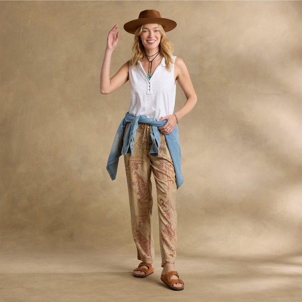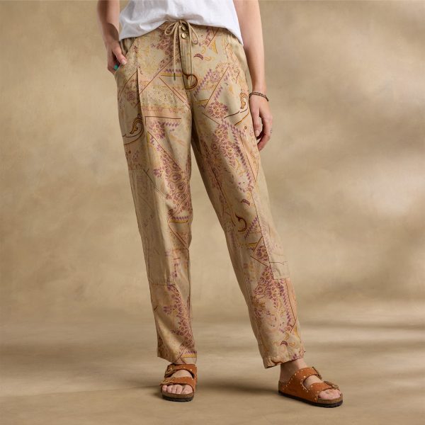 A charming mixed-print bandana pattern graces our flowing. straight-leg Ashanti Pants. So comfortable and flattering with antiqued silver snap closure and drawstring tie at elastic waist with zip fly and slant front pockets. Tencel®. Machine wash. Imported. Exclusive. Sizes 2–16. 27 inseam.