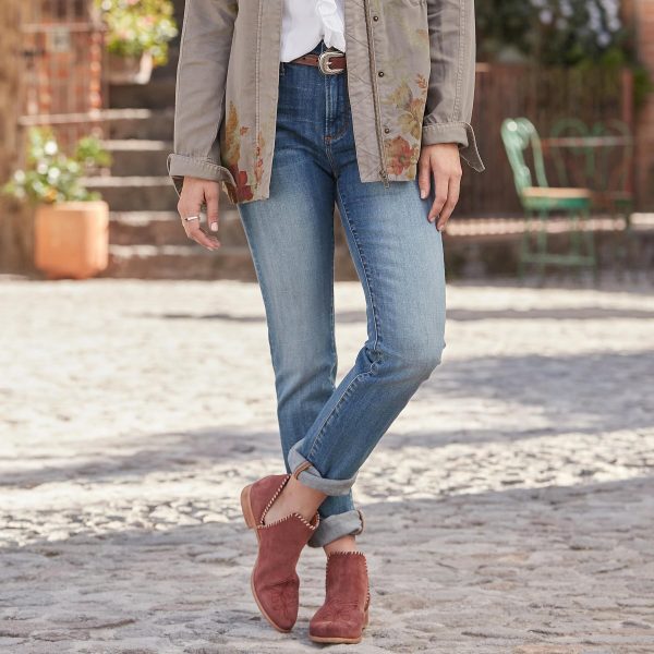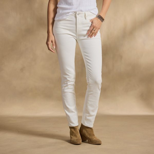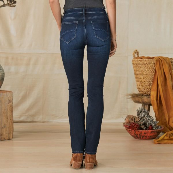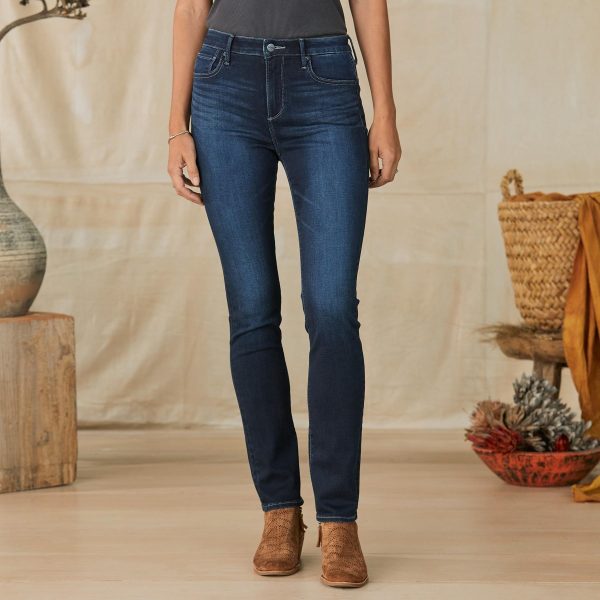 These flattering straight jeans are just the right hue of blue with the perfect amount of whiskering and fading to make them a number one contender for most comfortable. stylish wardrobe essential. Cotton/elastane. Machine wash. Imported. Sizes 24-34. 29. 31 or 33 inseam; 10.25 rise; 13.5 leg opening.