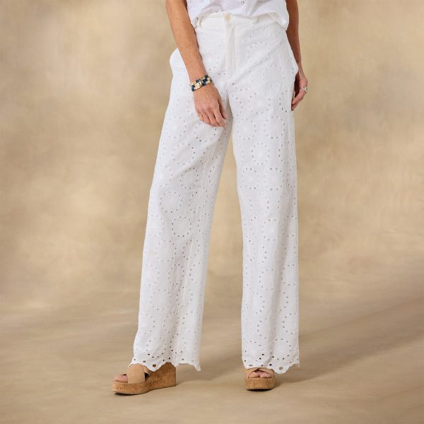 Sporty and feminine. our cotton gauze. eyelet pants are loose and flowing. with wide-leg silhouette. scalloped hem. side seam pockets and back patch pockets. Fully lined. with button closure zip fly and tie at waistline. Machine wash. Imported. Exclusive. Sizes 0?C14. 27.5 inseam