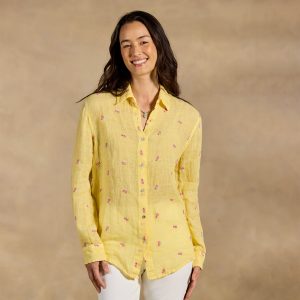Sustainably made in Greece with natural fabrics and dyes. this breezy. linen gauze shirt is peppered with Ditsy floral embroidery. Shell button front. Machine wash. Imported. Sizes XS (0–2). S (4–6). M (8–10). L (12–14). XL (16–18). Approx. 29l.