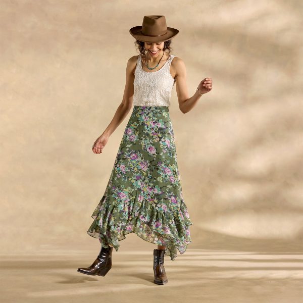 Can a garment be a garden party? Meet our Champs de Fleur Skirt??luxe lace fabric with an all-over floral pattern. an asymmetrical hemline and flirty ruffles. Elastic waistband. Polyester/rayon. Machine wash. Imported. Exclusive. Sizes XS (0?C2). S (4?C6). M (8?C10). L (12?C14). XL (16?C18). XXL (20?C22). 34.5l.