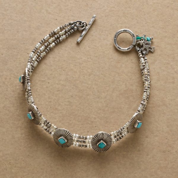 For the free spirit who embraces Southwest style. Our sterling silver bracelet sets five turquoise-studded conchos atop three beaded strands that secure with a toggle clasp. Handcrafted. Exclusive. 7 1/4l.