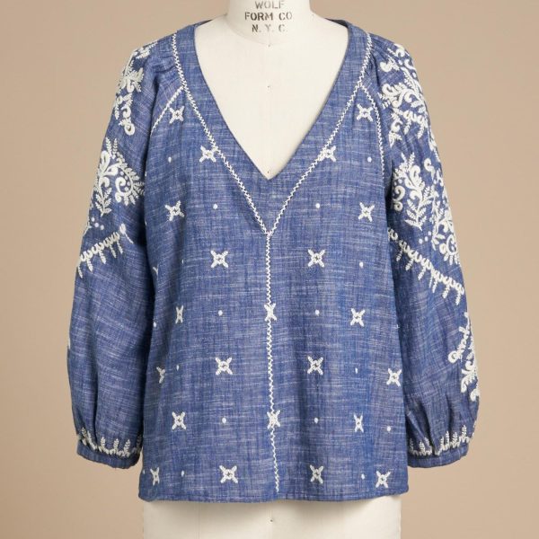 There’s joyful bohemian flair in this yarn-dyed top with luscious allover embroidery. blanket stitch details. three-quarter sleeves. shell buttons and V-neck. Full. easy fit. Cotton. Machine wash. Imported. Exclusive. Sizes XXS (00). XS (0 to 2). S (4 to 6). M (8 to 10). L (12 to 14). XL (16 to 18).Approx. 22-1/2L.