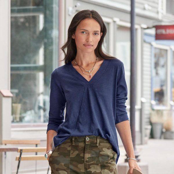 A Sundance favorite tee. now in three-quarter sleeve style. Comfy every day. this essential tee boasts subtle. directional seaming that flatters. V-neck and rounded hem. Cotton. Machine wash. Imported. Sundance exclusive. Sizes XS (0–2). S (4–6). M (8–10). L (12–14). XL (16–18). XXL (20–22). Approx. 29.75l.