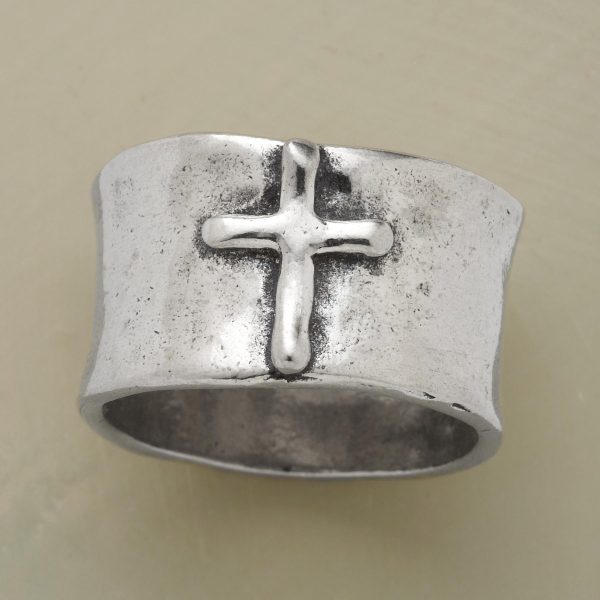 This faith ring features a cross on our gracefully curving. sterling silver band. Hand-hammering all around lends a primitive aspect to this Sundance exclusive. Whole sizes 5-9. 3/8w.