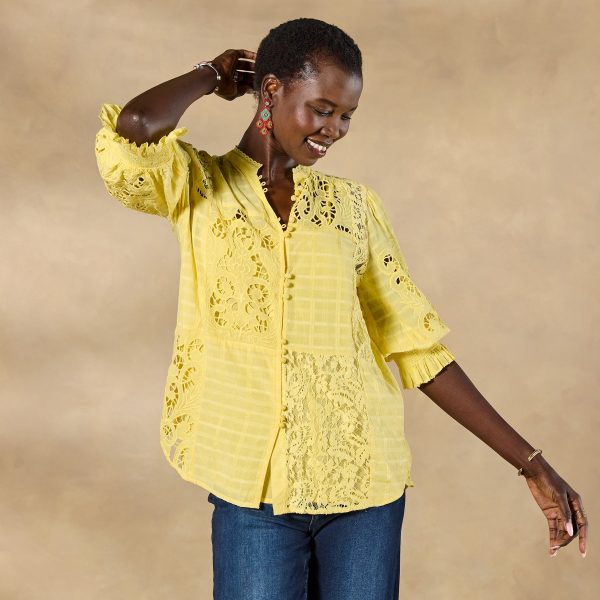 Patchworks of lace. delicate Chantilly and bold Venetian. intersperse with silky. windowpane fabric bringing texture and grace to a blouse with billowing sleeves and crocheted lace trim. Coordinating camisole with adjustable straps. Viscose/cotton. Hand wash. Imported. Exclusive. Sizes XS (2). S (4-6). M. (8-10). L (12-14). XL (16-18). XXL (20-22). Approx. 25.5l.