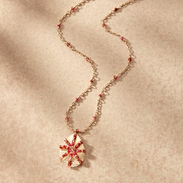A star is born from garnet. ruby. red jasper and glass seed beads wrapped around a hammered pendant. Lobster clasp. Handmade in USA of 14kt gold filled with 12kt gold-filled wire. 17l.