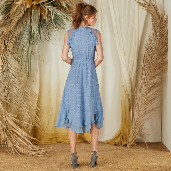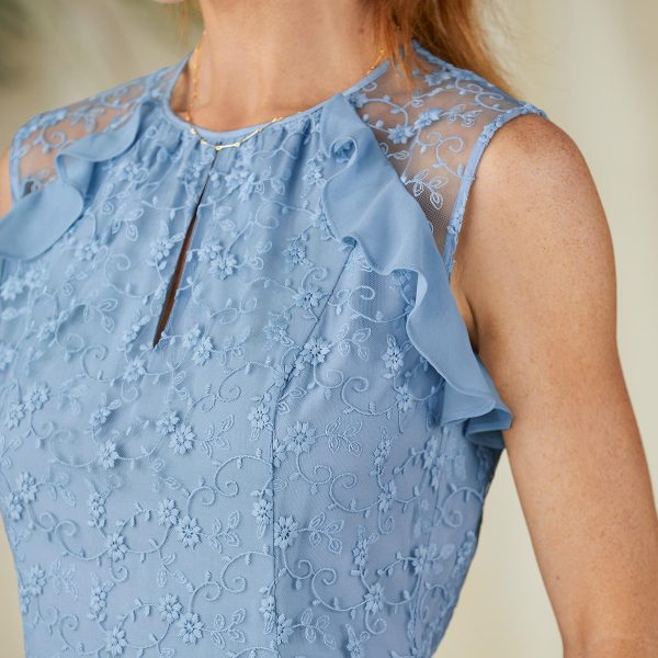 Dazzle in this dreamy dress. highlighted by a beautiful. drapey silhouette of ruffles at the hem and shoulders. all-over embroidered mesh. peek-a-boo notch neckline and elastic waist at back for ease. Zipper back with hook and eye closure. Fully lined with sheer shoulders. Polyester. Hand wash. Imported. Exclusive. XS (0-2). S (4-6). M (8-10). L (12-14). XL (16-18). XXL (20-22). Approx. 48l.