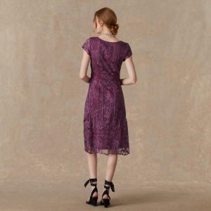 Easy. fit and flare. embroidered soutache mesh dress. with cap sleeves. scalloped hem and sleeves and a flattering. soft V-neckline. Pull-on styling. Lined. Nylon. Dry clean. Imported. Exclusive. Sizes XS (0-2). S (4-6). M (8-10). L (12-14). XL (16-18). XXL (20-22). Approx. 44l.