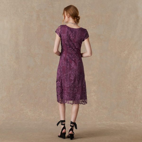 Easy. fit and flare. embroidered soutache mesh dress. with cap sleeves. scalloped hem and sleeves and a flattering. soft V-neckline. Pull-on styling. Lined. Nylon. Dry clean. Imported. Exclusive. Sizes XS (0-2). S (4-6). M (8-10). L (12-14). XL (16-18). XXL (20-22). Approx. 44l.