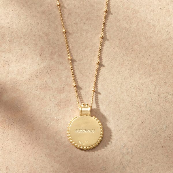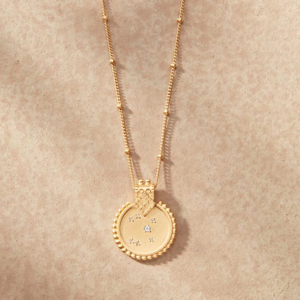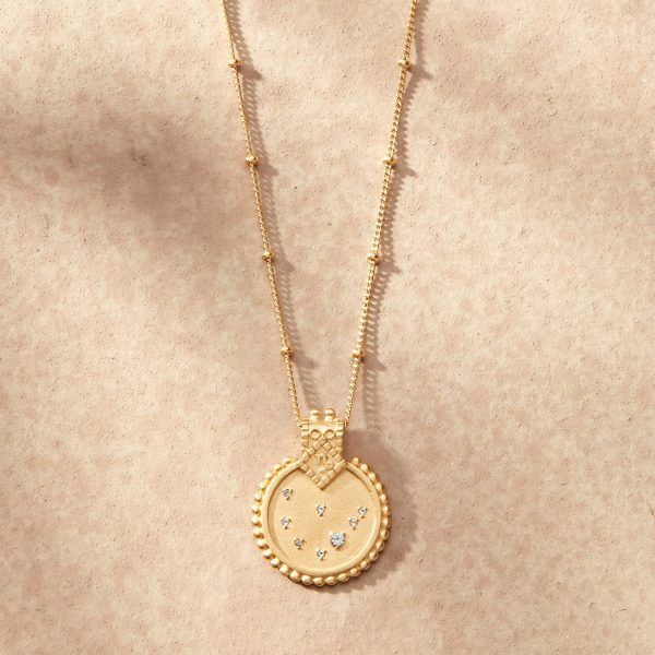 Constellations in sparkling white topaz remind us that we are governed by the stars. Handcrafted in 18kt gold plate. Spring ring clasp. Exclusive. Specify zodiac sign. 18l. 7/8 drop.