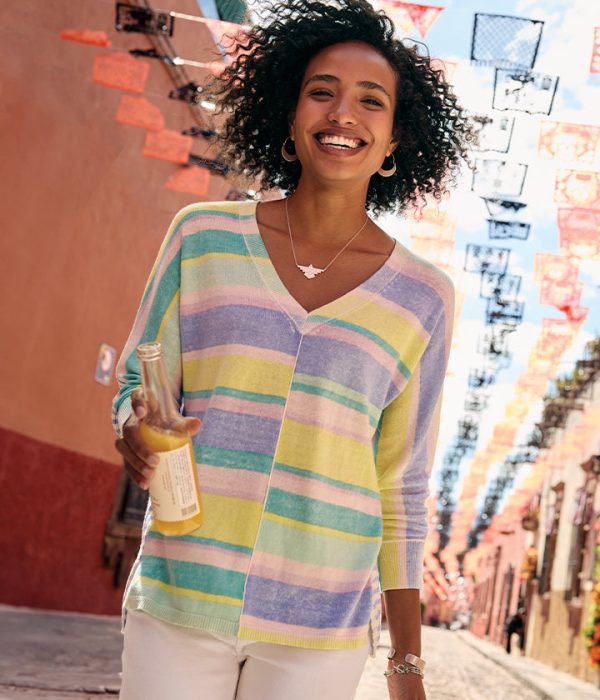 Our lightweight. faded. reverse-print sweater with exposed seaming. side slits and rib trim. Three-quarter sleeves. Cotton. Hand wash. expect dye transfer or loss. Imported. Exclusive. Sizes XS (0-2). S (4-6). M (8-10). L (12-14). XL (16-18). XXL (20-22). Approx. 23.5l.