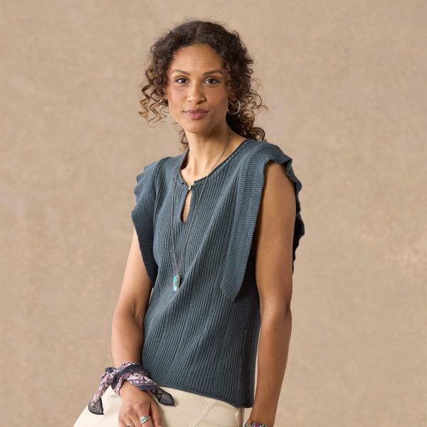 This ribbed cable sweater features a variety of textures. flutter sleeves and a front keyhole with button. Polyester/viscose. Hand wash. Imported. Sizes XS (0?C2). S (4?C6). M (8?C10). L (12?C14). XL (16?C18). Approx. 22l.