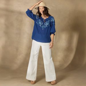Light. airy and easygoing. our Junco Floral Top features a smocked notch neckline and cuffs with ruffle trim. subtle high-low hem and tonal embroidery on the bodice and sleeves. Cotton/poly. Machine wash. cold. Imported. Exclusive. Sizes XS (0–2). S (4–6). M (8–10). L (12–14). XL (16–18). XXL (20–22).