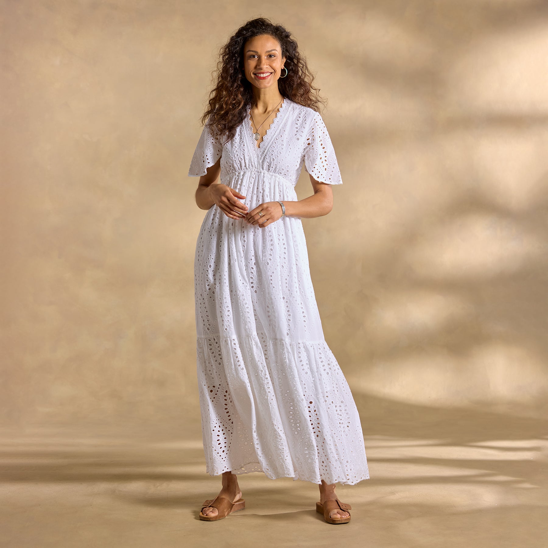 Nothing says weekend like crisp white from head to toe. Fresh and feminine. our essential Juno maxi features all-over eyelet with an easy elastic waistband. flirty flutter sleeves and pretty lace trim at the neckline. Cotton. Machine wash. Imported. Exclusive. Sizes XXS (00). XS (0–2). S (4–6). M (8–10). L (12–14). XL (16–18). Approx. 49.75l.