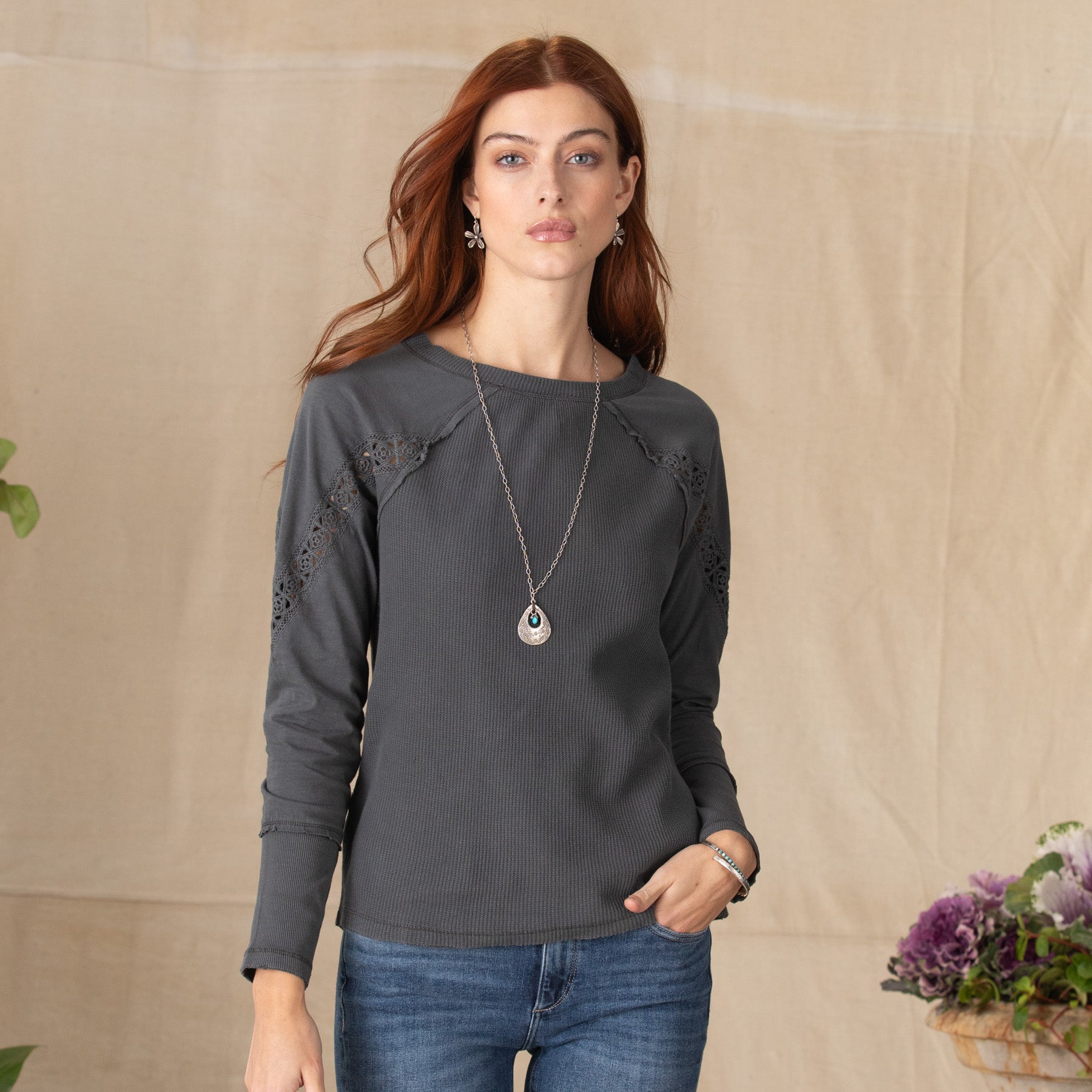 Relaxed. mixed media pullover with easy dolman sleeves. lace inserts. Hi-lo hem. Cotton. Machine wash. Imported. Exclusive. Charcoal. jasper green or maroon. Sizes XS (0 to 2). S (4 to 6). M (8 to 10). L (12 to 14). XL (16 to 18). XXL (20 to 22). Front approx. 24-1/2L.