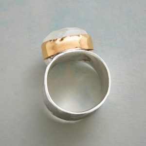 In this moonstone. 14kt gold and sterling ring. the faceted gemstone. luminous and lovely. rises above a 14kt gold bezel on a wide band of polished sterling silver. Whole sizes 5-9. 5/8w.
