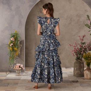 This distinctive party dress features a beautiful print. a V-neck in front and back. ruffled sleeves and asymmetric ruffled tiers. Full maxi length. Cotton. Machine wash. Imported. Sizes 2 to 16. Approx. 55-1/2L.