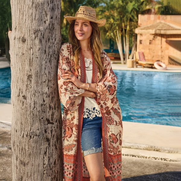 From morning coffee on the patio to après-beach time and beyond. our easy. open-front kimono elevates your every day. With an elegant drape that will make you feel beautiful. charming border print and side-seam pockets. Viscose. Machine wash. Exclusive. Sizes XS (0–2). S (4–6). M (8–10). L (12–14). XL (16–18). XXL (20–22). Approx. 43.5l.