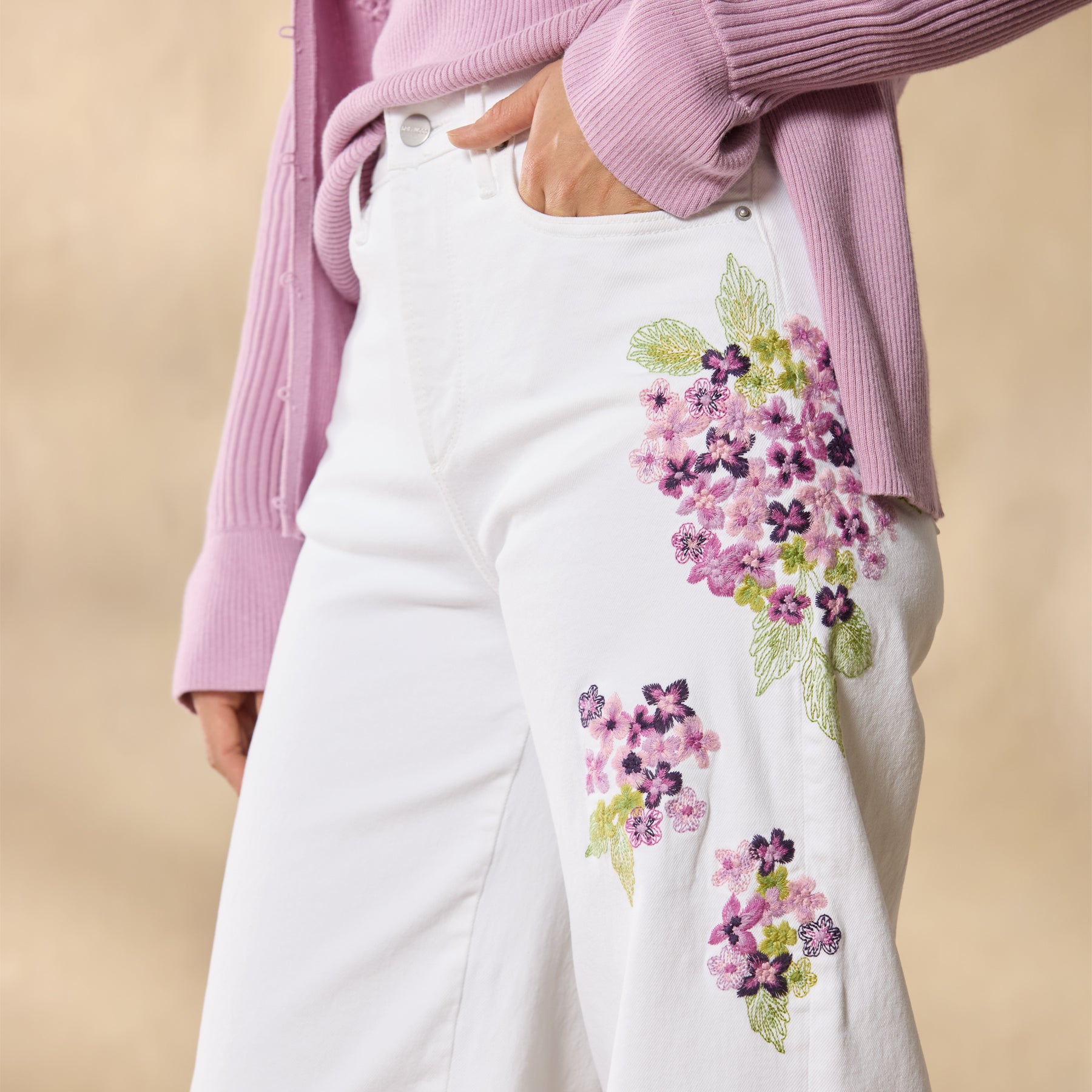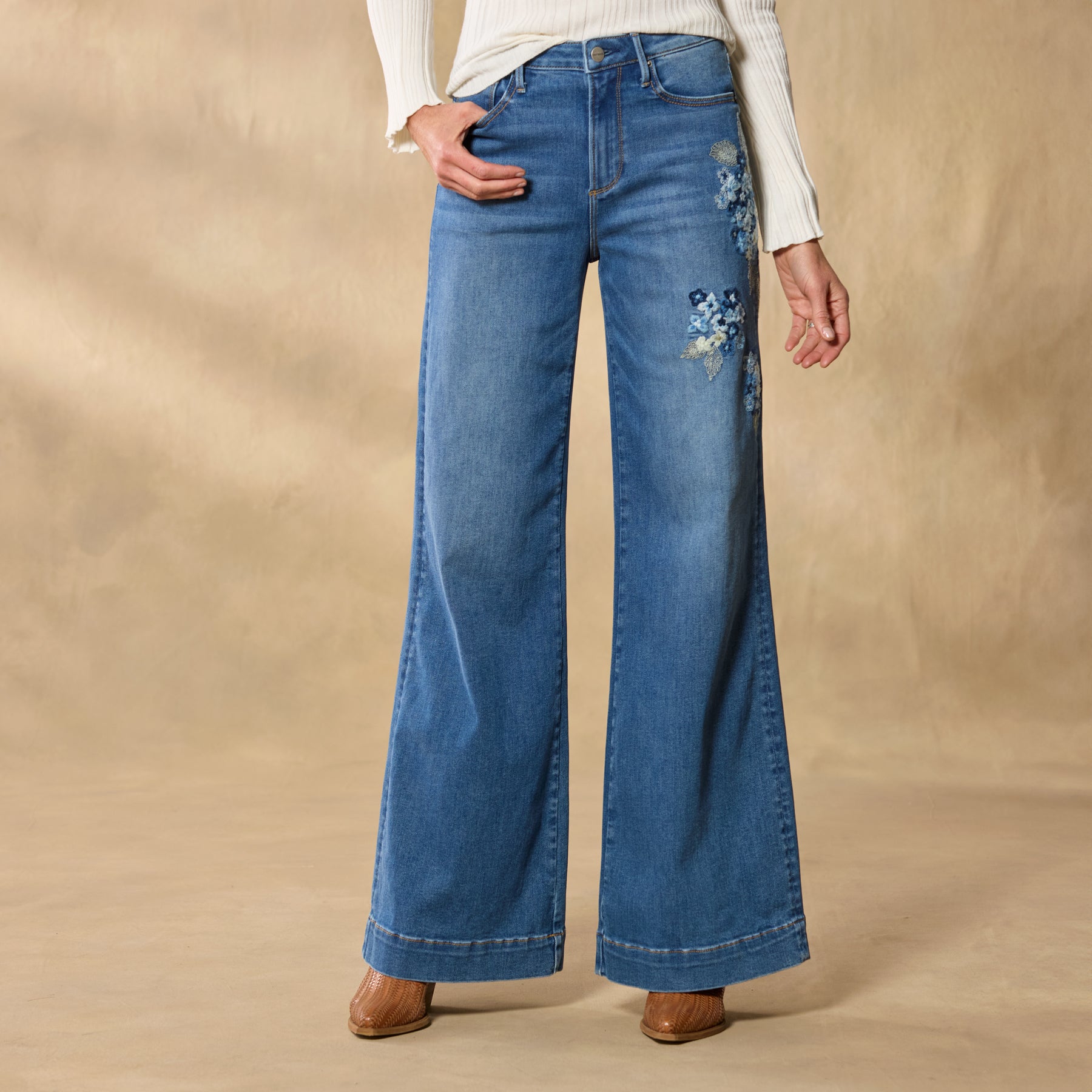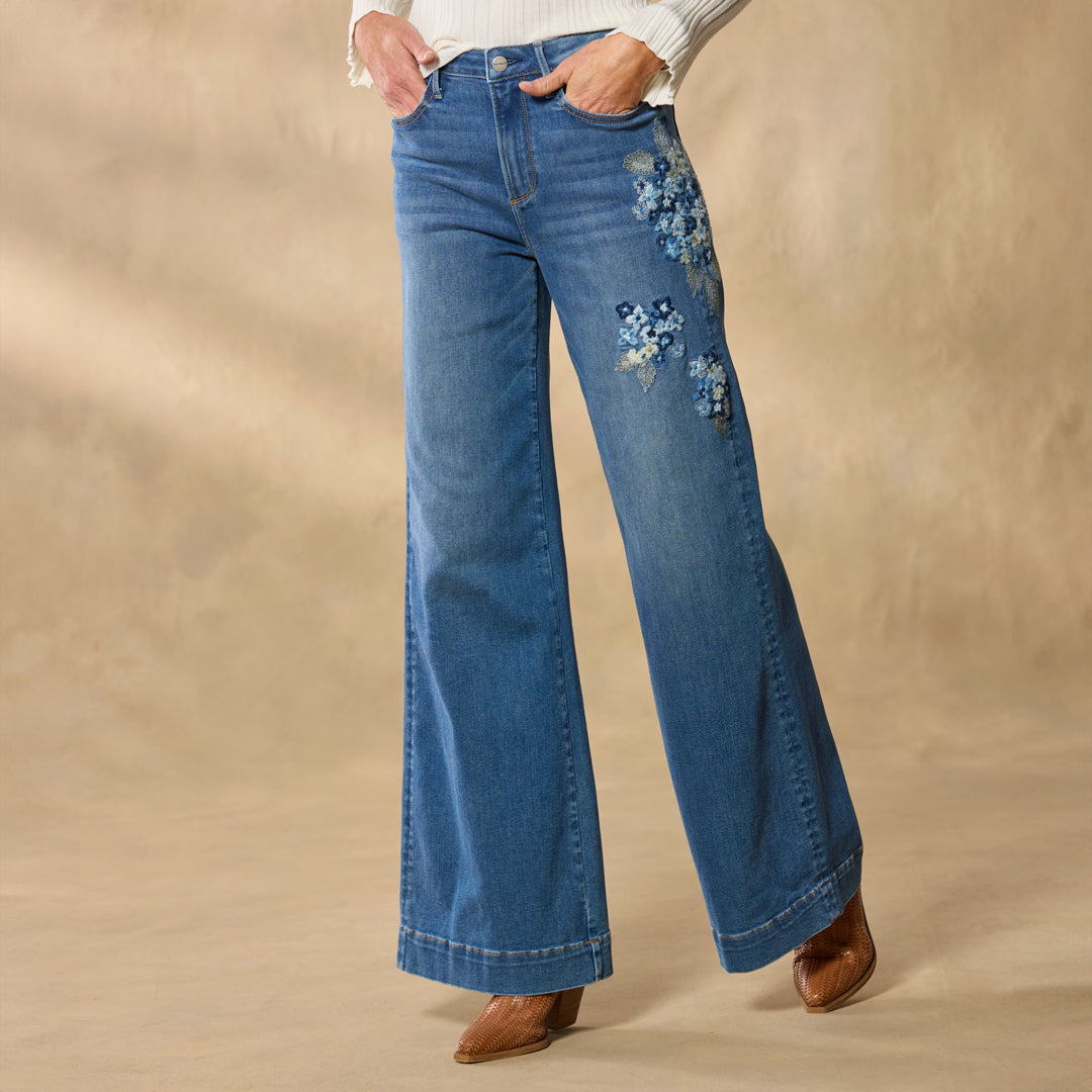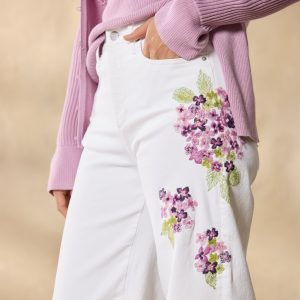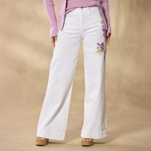 The breeziest wide-leg pants. artfully embellished with beautiful embroidery. Five-pocket styling. Cotton/polyester/spandex. Machine wash. Imported. Sundance exclusive. Sizes 24?C32. 30. 32 or 34 inseam; 11 rise; 26 leg opening.