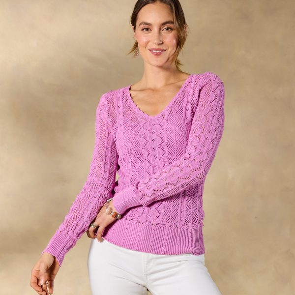 Open pointelle stitch adds light and airy style to this versatile. V-neck sweater with hand-crocheted neckline detail. rib trim. and refined sleeve shape. Camisole included. Cotton/linen. Hand wash. Imported. Exclusive. XS (0-2). S (4-6). M (8-10). L (12-14). XL (16-18). XXL (20-22). Approx. 23l.