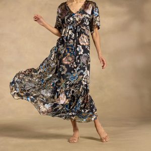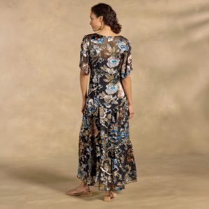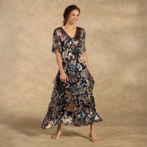 This stunning. iridescent. burnout velvet dress features a v-neck. short sleeves and tie at the waist. Slip included. Viscose/silk/polyester/spandex. Dry clean. Imported. Exclusive. Sizes XS (0–2). S (4–6). M (8–10). L (12–14). XL (16–18). XXL (20–22).