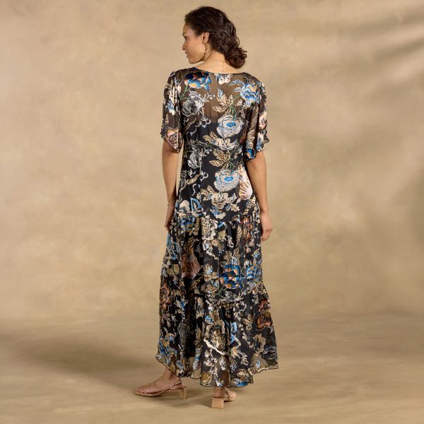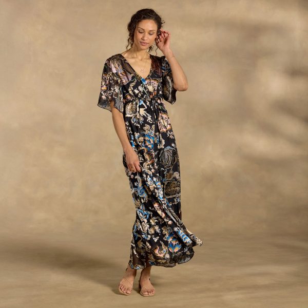This stunning. iridescent. burnout velvet dress features a v-neck. short sleeves and tie at the waist. Slip included. Viscose/silk/polyester/spandex. Dry clean. Imported. Exclusive. Sizes XS (0–2). S (4–6). M (8–10). L (12–14). XL (16–18). XXL (20–22).