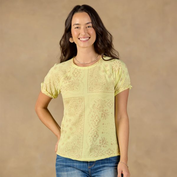 Allover bandana prints add a touch of Western flair to Miranda: our printed crewneck tee with raglan sleeves. raw-edge details and comfortable side vents. Cotton. Machine wash. Imported. Exclusive. Sizes XS (0–2). S (4–6). M (8–10). L (12–14). XL (16–18). XXL (20–22). Approx. 23l.