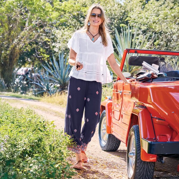 Our Niovi Pants are fashioned from the most delightful crinkle rayon crepe for the easiest. breeziest lightweight feel. In a cropped. wide-leg silhouette. with colorful allover embroidery and crochet tassel detail on elastic waistband tie. Great travel pants! Hand wash. Imported. Exclusive. Sizes XS (0–2). S (4–6). M (8–10). L (12–14). XL (16–18). XXL (20–22). 23 inseam.