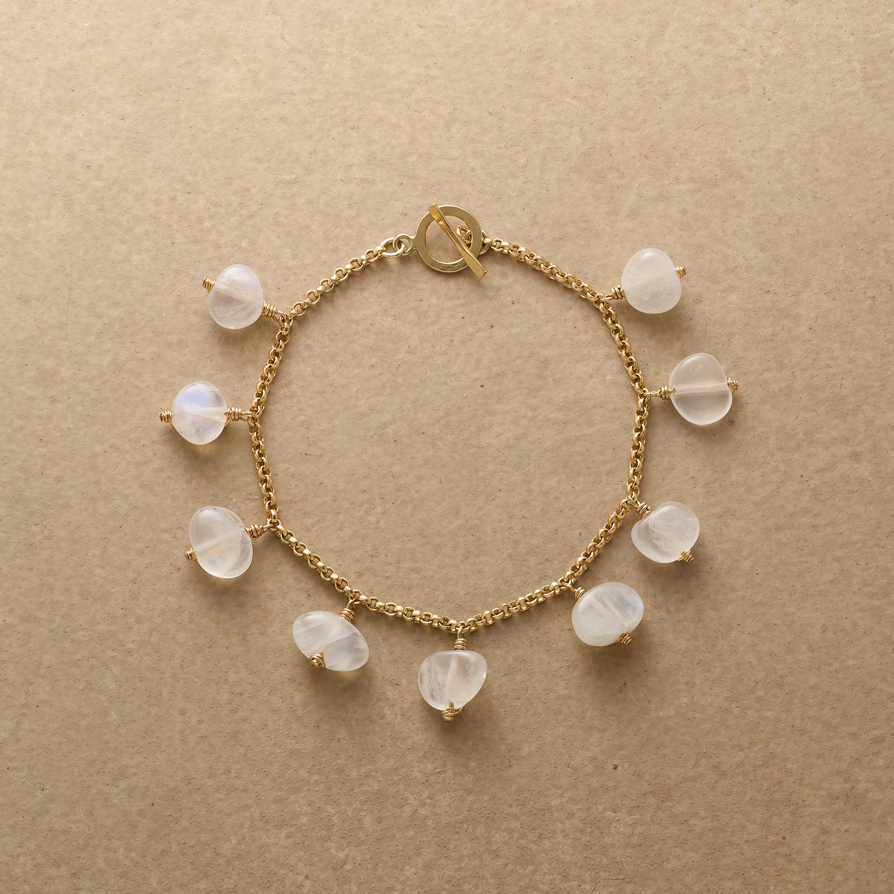 Named after a meteor shower. our Perseid Bracelet is a spectacle of style that can be enjoyed evening or daytime. Handmade with rainbow moonstone and 14kt gold-filled chain. Toggle clasp. USA. 7l.