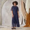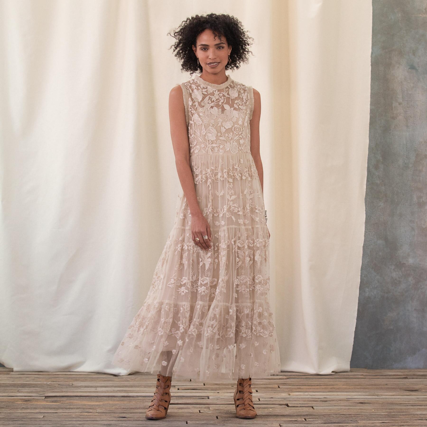 Dreamy lace enchants in this ruffle tiered. sleeveless. maxi dress with tonal embroidery and lining. Polyester. Dry clean. Imported. Sizes XS (0-2). S (4-6). M (8-10). L (12-14). XL (16). Approx. 55l.