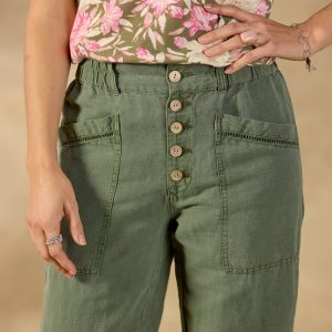 Our relaxed-fit Rivera Pants feature a classic straight-leg fit with a flat front and comfy elastic back—plus pretty ladder lace on the patch pockets. Cotton/linen. Machine wash. Imported. Exclusive. Sizes 0–14. 26 inseam.