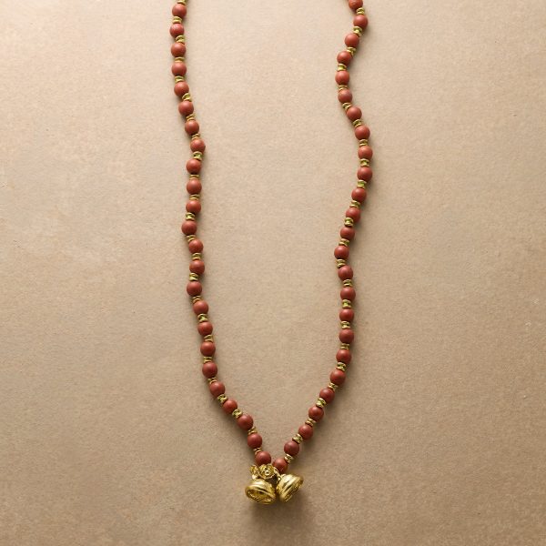 Long enough to slip over your head. this hand-knotted gemstone necklace is easy to wear and ready for adventure. Red jasper and lapis beads; brass spacers. bells and blossoms. Imported. 32l.