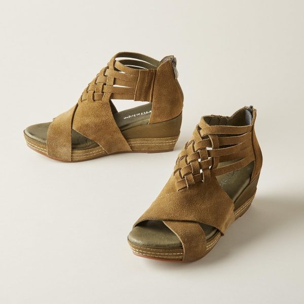 Eye-catching curves and all-day comfort are a winning combination in these woven. pebbled leather sandals with back zippers and extra-thick. cushioned insoles. Imported. Euro whole sizes 36-41. 36 (US 5). 37 (US 6). 38 (US 7). 39 (US 8). 40 (US 9). 41 (US 10). 2 wedge.