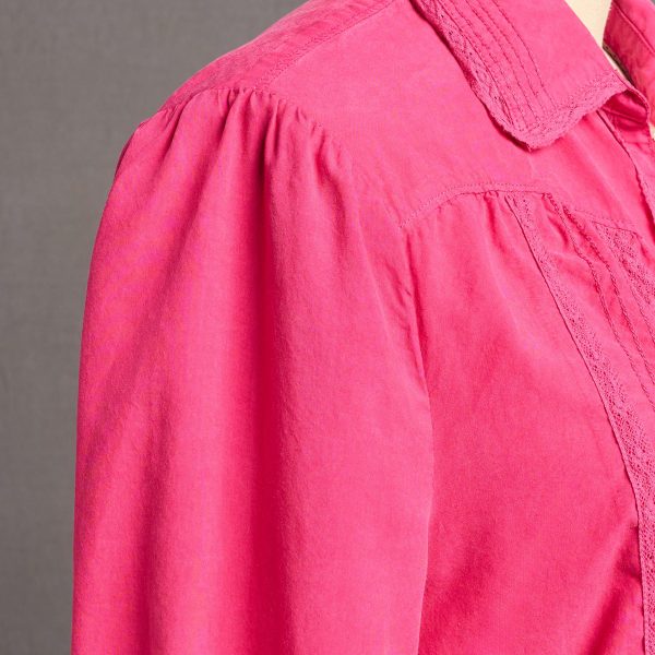 Western style at its most feminine. in beautifully washed. super soft and draping Tencel®. With embroidery and lace insert details at front panel and collar. ruffle cuffs. raw edges. delicate loop closures on smoked shell button front. shirttail hem and Western-style yoke front and back. Machine wash. Imported. Exclusive. Sizes XXS (00). XS (0-2). S (4-6). M (8-10). L (12-14). XL (16-18). Approx. 26l.