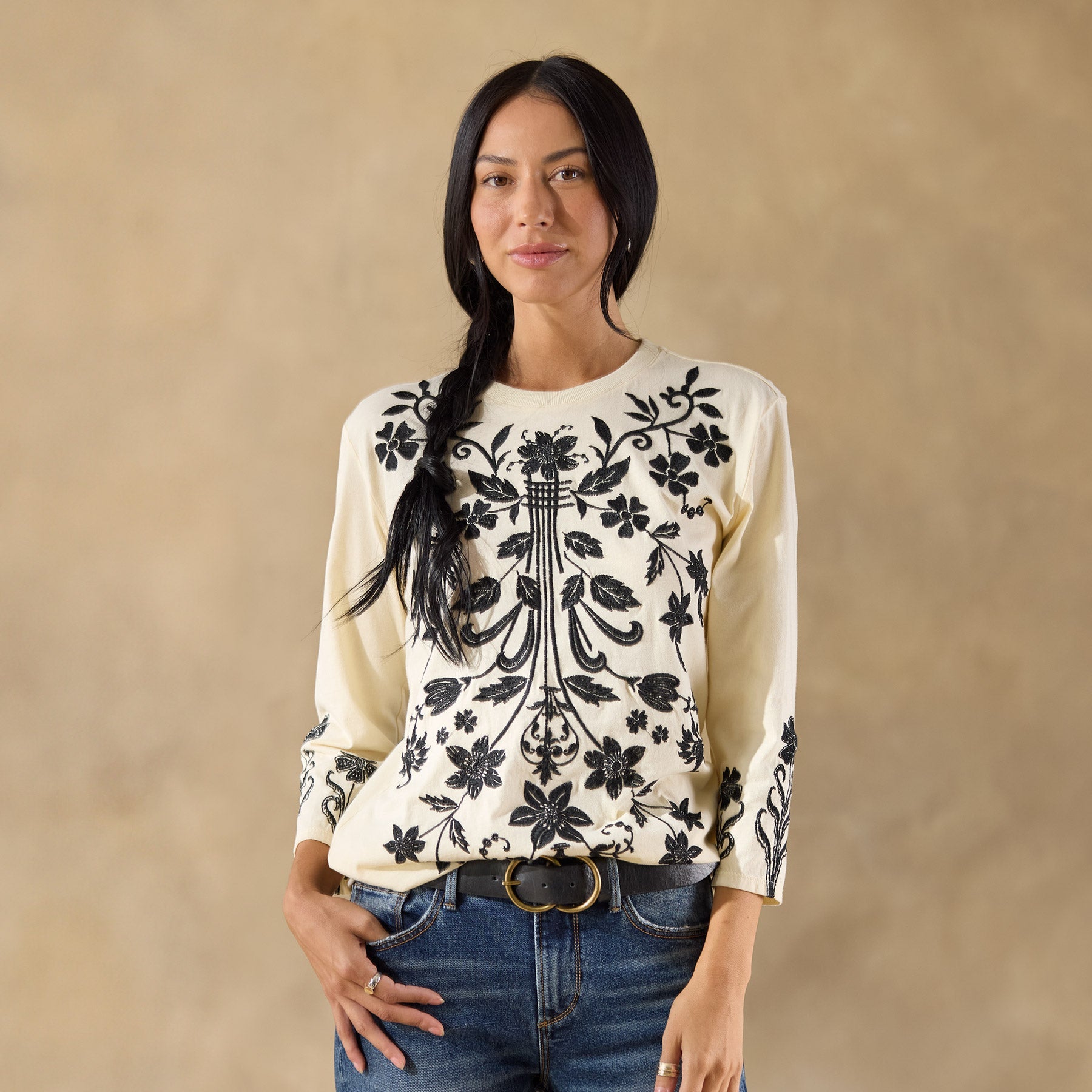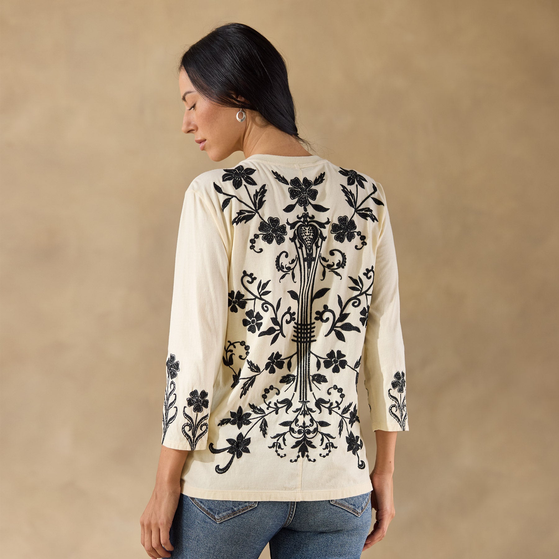 This crewneck tee boasts all-over embroidery on the front. back and sleeves. Cotton. Machine wash. Imported. Sizes XS (0–2). S (4–6). M (8–10). L (12–14). XL (16–18). XXL (20–22). Approx. 26l.