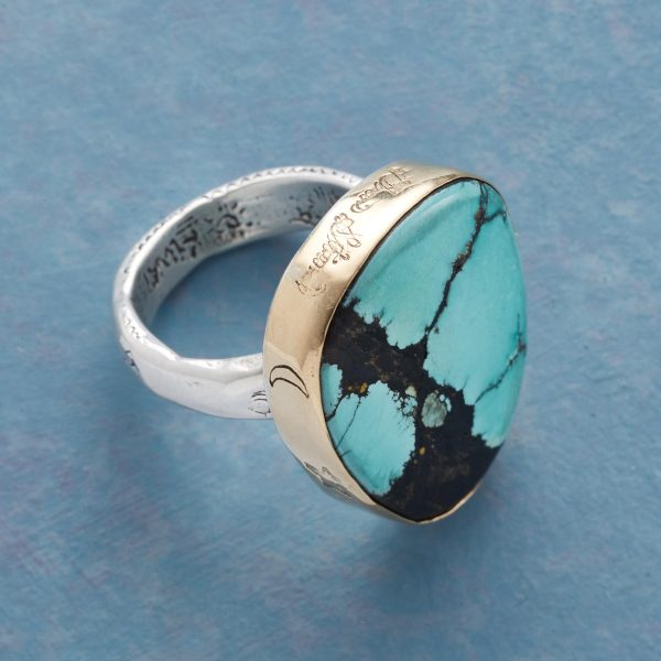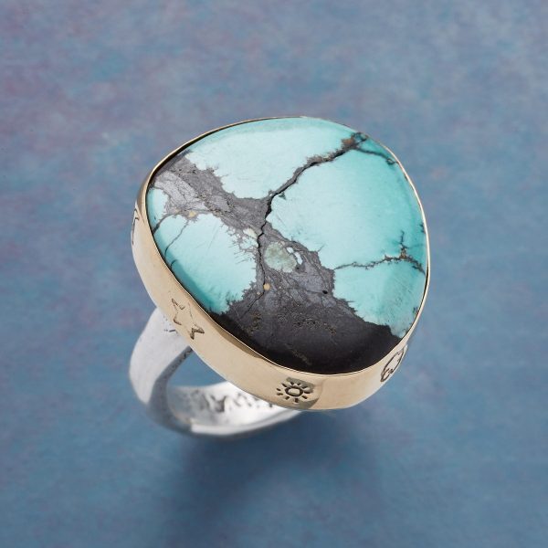 Nature’s artistry makes each of these turquoise rings utterly. beautifully unique. Jes MaHarry sets the stone in 14kt gold atop a sterling silver band etched with A star. moon. cloud. sun and the words Grow Strong. Handmade in USA. Exclusive. Whole sizes 5-9.