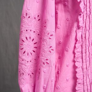 An oh-so-feminine shell button-up shirt. with whimsical embroidered polka dots. medallion embroidery and openwork. pintucks and lace inserts. scalloped ruffle detail and bishop sleeves. Cotton. Machine wash. Imported. Exclusive. Sizes XS (0-2). S (4-6). M (8-10). L (12-14). XL (16-18). XXL (20-22). Approx. 26l.
