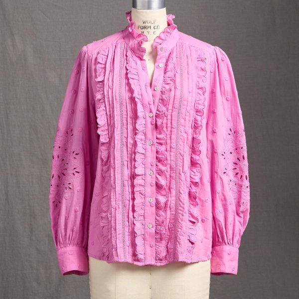 An oh-so-feminine shell button-up shirt. with whimsical embroidered polka dots. medallion embroidery and openwork. pintucks and lace inserts. scalloped ruffle detail and bishop sleeves. Cotton. Machine wash. Imported. Exclusive. Sizes XS (0-2). S (4-6). M (8-10). L (12-14). XL (16-18). XXL (20-22). Approx. 26l.