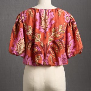 The joy of color. Our stunning engineered print linen top is so flattering with puff sleeves and elastic waist. Scoop neck and back notch with button and loop closure. Fully lined. Machine wash. Imported. Sundance exclusive. Sizes XS (0–2). S (4–6). M (8–10). L (12–14). XL (16–18). XXL (20–22). Approx. 21l.