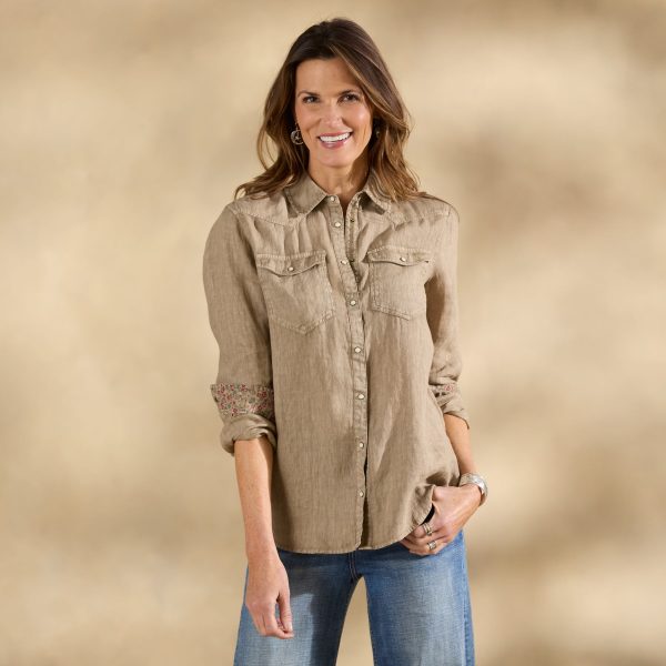 Sundance’s favorite classic Western shirt with contrast floral print inside and twill tape detail at the placket. Snap button front. two front patch pockets with snaps. Linen. Machine wash. Imported. Exclusive. Sizes XXS (0). XS (0-2). S (4-6). M (8-10). L (12-14). XL (16-18). Approx. 24.5l.
