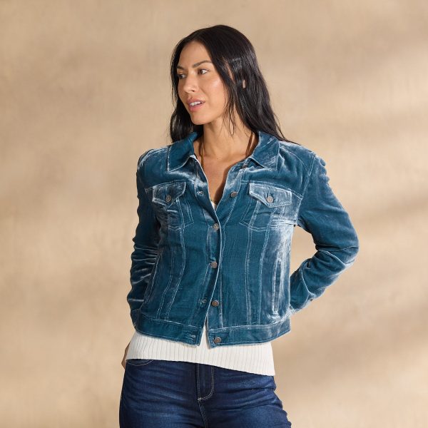 A classic jean jacket silhouette. but in soft. subtly shimmery velvet. Dress it up or down. Fully lined. Four pockets. Viscose/silk. Dry clean. Imported. Exclusive. Sizes XXS (00). XS (0?C2). S (4?C6). M (8?C10). L (12?C14). XL (16?C18). Approx. 20l.