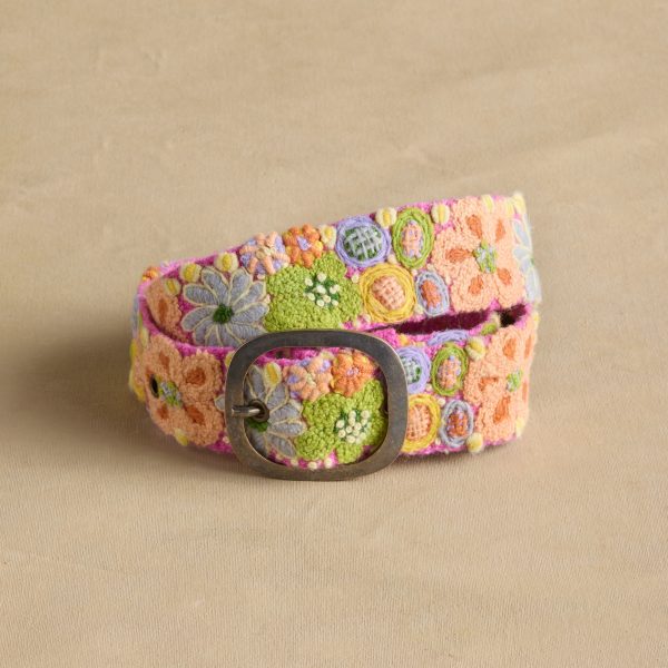 Blooms abound on this embroidered wool belt like wildflowers in a meadow. Five sets of holes allow the belt to be worn at the hips or the waist. Handcrafted in Peru. Metal buckle. Sizes S (32). M (34). L (36). Approx. 1.78 wide.